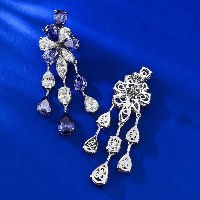 Tassel Classic White & Blue Pear Cut Moissanite Diamond Elegant 18k White Gold Plated Drop Earrings | Mix Mix Style