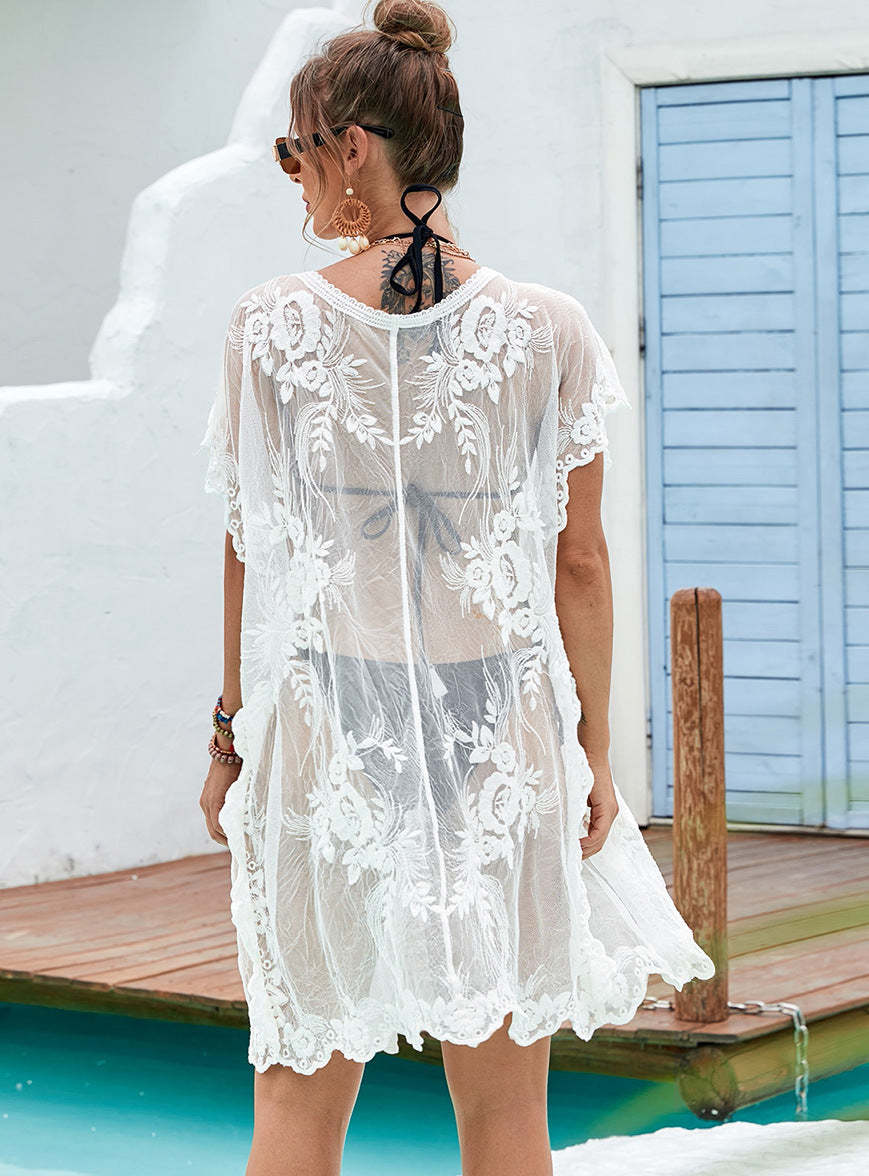 white see-through short sleeve embroidery swimsuit cardigan cover-up | Mix Mix Style